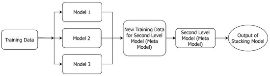 Figure 1 shows the flowchart of a stacked model [40], which uses output predictions from multiple base models trained on the same dataset to train another ML model (meta-model) to make the final predictions [41]. Please note that the meta-model will assign different weights to the base models to maximize the performance of the proposed ensemble method.