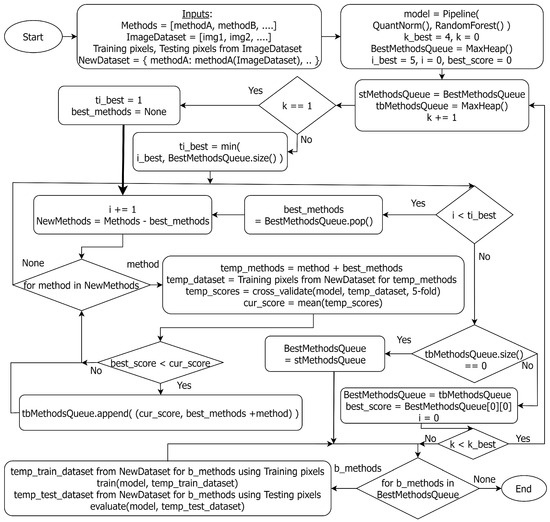 Additionally, our empirical analysis showed that the combination of base models that yields the best outcomes varies based on the given scenario. As a result, we put our effort into identifying a more systematic and efficient method for base model selection in a weighted voting ensemble. Figure 2 shows the overall flowchart of the GE-AD algorithm, and our proposed greedy search is depicted in Figure 3. The GE-AD algorithm uses consistent stratified 2-fold cross-validation. K-fold cross-validation is a widely used technique to assess the accuracy of a model [53,54,55]. It splits the training dataset into K subsets or folds. The model is trained using of the folds as training data, and the resulting model is validated on the remaining part of the data. The model is trained and evaluated K times, with each fold serving as the validation set in turn and being used for validation exactly once. The performance metrics obtained from each fold are then averaged to estimate the model’s generalization performance. In our approach, 2-fold cross-validation divides the pixels in our data into 50–50 split training and testing datasets and evaluates the performance of our GE-AD algorithm twice. Our evaluation found that getting stuck in a local maxima can hinder searching for the best methods. We solved this issue by running the search algorithm five times. We included this -fold cross-validation as a part of the GE-AD algorithm to ensure that we find the best combinations. Out of these ten sets of results, GE-AD identifies which combinations survived the most. If there is a tie, it uses first the average test score and then the average training score to break the tie.