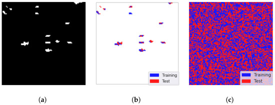 Visualization of the train–test split (seed = 842) of ABU-I data to train our proposed ensemble (GE-AD) method. (a) Ground truth, (b) split of anomalies only (blue for training and red for testing), and (c) complete train–test split.