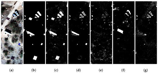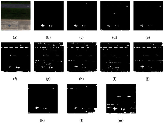 Visual comparison showing better performance of our proposed ensemble method (GE-AD) compared to other methods using ABU-IV data. (a) RGB, (b) ground truth, (c) GE-AD (F1 = 0.856), (d) HUE-AD (F1 = 0.649), (e) Abundance (F1 = 0.735), (f) AED (F1 = 0.610), (g) KIFD (F1 = 0.587), (h) KRX (F1 = 0.604), (i) LSUNRSORAD (F1 = 0.569), (j) FCBAD (F1 = 0.631), (k) ERRX MF (F1 = 0.666), (l) ERCRD (F1 = 0.545), and (m) SED (F1 = 0.592). Please note that, as the implementations of algorithms for Figures (k–m) were not publicly available, we binarized the original outputs from the authors’ papers [22,25,26], respectively.