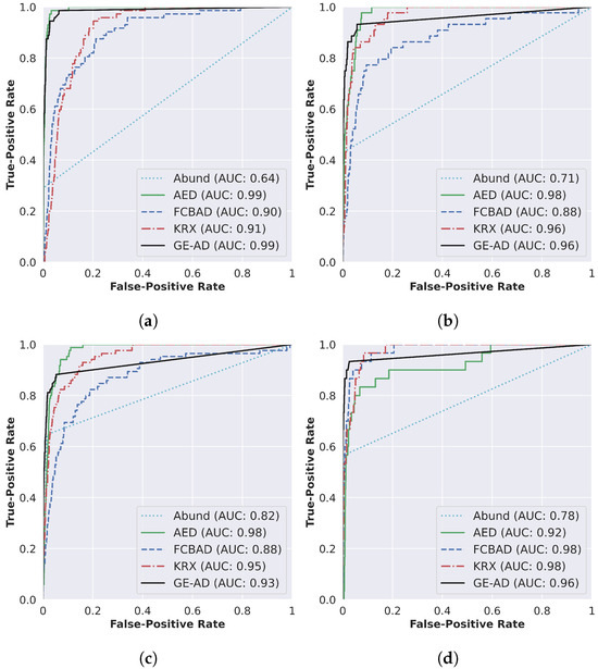 Traditional classification evaluation metrics could be applied to evaluate the proposed GE-AD algorithm. An example of those metrics is the ROC (receiver operating characteristic) curve. It visually represents a binary classifier model’s efficacy across various classification thresholds. The ROC curve plots the true positive rate (TPR) versus the false positive rate (FPR) at each threshold. The decrease in the classification threshold classifies more items as positive, which may increase both false positives and true positives. AUC (area under the ROC curve) [67,68,69] measures the total two-dimensional area under the ROC curve, comprehensively evaluating the model’s performance across all potential classification thresholds.