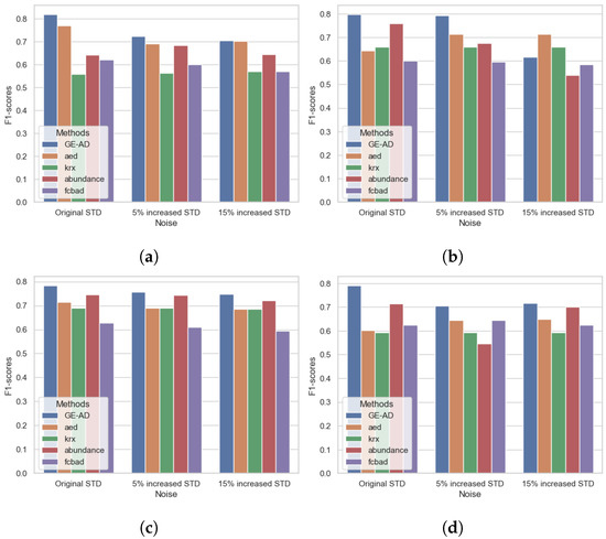 In addition to the F1-macro metric, we also determined the ROC AUC scores [67] for each algorithm as the authors of other papers evaluated their work using this metric. The results are summarized in Figure 6. Note that even though GE-AD model-1 resulted in outputs that are visually closer to the ground-truth data, it failed to achieve a higher ROC AUC score compared to all the methods used in the ensemble. This demonstrates that a single metric is not sufficient to assess the performance.