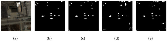 The scenes depicted in Figure S1, included in the Supplementary Materials, highlight the performance differences resulting from the implementation of different threshold values for the Median AD method. For example, some targets are missing in the Arizona dataset Image V prediction compared to the ground truth. By increasing the threshold, F1-macro scores improve slightly as the higher threshold removes some false positive detections. Table 2 summarizes the F1-macro score using images from the Arizona dataset thresholded at the 90th, 95th, and 97th percentile values.