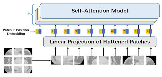 Unlike the self-attention mechanism in natural language processing, with a word as an input vector, the self-attention mechanism used in the network mode proposed in this study cut an original image into several smaller n × n image patches using convolution with a size of n × n and a step of n. These image patches were converted into patch embeddings, with upper position encoding added as the input part of the MHSA at the same time. The MHSA mechanism is displayed in Figure 2.
