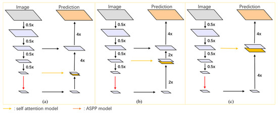 In this study, a 12-layer self-attention mechanism module with 12 heads was utilized. The module underwent multiple down-sampling processes via Xception, each time with a down-sampling rate of 0.5×, resulting in 4×, 8×, and 16× down-sampled outputs. These outputs were then input into MHSA mechanisms with patch sizes of 4 × 4, 3 × 3, and 2 × 2, respectively, to obtain global semantic information feature maps at three different scales (corresponding to (a) 16×_res to MHSA network, (b) 8×_res to MHSA network, and (c) 4×_res to MHSA network in the figure).