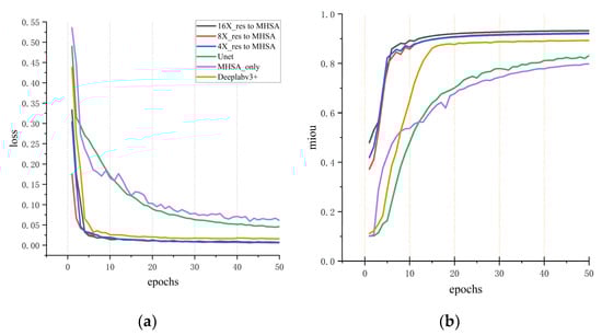 In the whole heart segmentation task described above, several experiments were conducted to compare the method proposed in this study with other advanced methods. The segmentation results on different indexes for cardiac CT and MRI images are summarized in Table 1, Table 2, Table 3 and Table 4. Initially, the method proposed in this study was compared with advanced methods, including Segmenter, U-net, and DeepLab V3+ network, for MIoU performance on cardiac CT datasets (Table 1). For the sake of fairness, datasets with augmented data were used for comparison, and the training strategy and experimental equipment were the same. To accelerate the training of networks, the pre-training DeepLab V3+ model for CT data was imported into the model proposed in this study. As shown in Table 1, the MIoU of the proposed three networks at different scales topped out at 93.7%. It can also be seen from Figure 7a,b that the MSMHSA-DeepLab V3+ network model proposed in this study outperformed the network models, which had not been improved in terms of either the convergence rate or the segmentation results.
