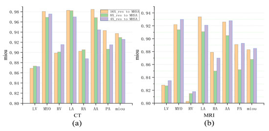 Figure 8a intuitively demonstrates the impact of MHSAs at three different scales on the final experimental results. In fact, this multi-scale comparison can be understood as the result analysis of multi-scale ablation experiments. As shown in the figure, for the larger left ventricle (LV), better segmentation results were obtained using MHSA at a larger scale (4×_res to MHSA) in both CT images and MRI images. However, for the smaller ascending aorta (AA) and pulmonary artery (PA), better results were achieved using MHSA at a smaller scale (16×_res to MHSA). The above results did not apply to the left ventricular myocardium (Myo) with its more complex morphology, and the differences among MHSA models at different scales were small. For the moderately sized right atrium (RA) and right ventricle (RV), better results were obtained using MHSA at a medium scale (8×_res to MHSA) and at a smaller scale (16×_res to MHSA), while for the left atrium (LA), better results were achieved using MHSA at a smaller scale (16×_res to MHSA).