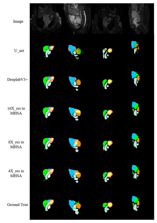 Figure 9 shows the segmentation results of the proposed networks on the cardiac CT image test set along with the segmentation results of the MHSA mechanism only, U-net, and DeepLab V3+. For CT images, the application of the self-attention mechanism in the 16-fold down-sampling results achieved better similarity to the real labels, but for substructures with a smaller size, the results were still lacking. However, the proposed networks had quite a good advantage over DeepLab V3+ and other networks. Moreover, the proposed networks were more accurate in predicting the boundary of the AA (the white region in Figure 9) and had visually better predicted results for the LV (the pink region in Figure 9) than those by other networks.