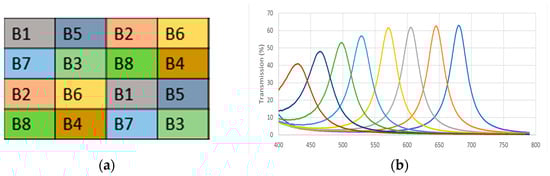 Figure 1b shows the filters’ spectral response in our MSFA model. Spectral response refers to how well the sensor detects and measures light in different spectral bands. This spectral response is given in the visible spectral interval [400 nm, 790 nm].
