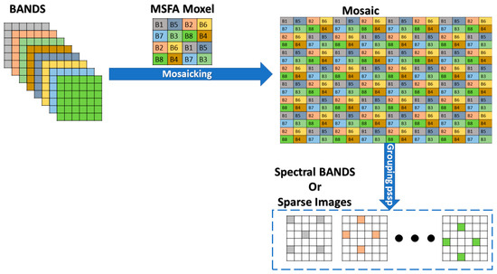 A mosaic image captured by our camera produces 8 sparse images after grouping pixels with similar spectral properties. Since we will be working with fully defined images, we use our MSFA moxel to generate mosaics from them. Figure 2 illustrates the mosaicking process with our MSFA moxel and the grouping of pixels with similar spectral properties into sparse images.
