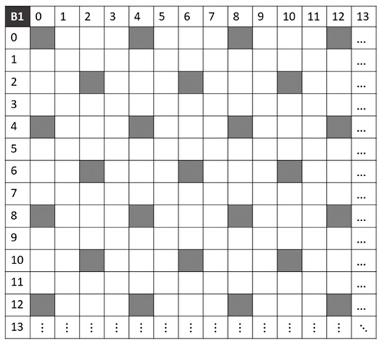 Figure 5 shows the density of pixels that are spectrally similar in band B1 of the mosaics and . The gray areas represent the available pixels in the sparse image of the band B1; the yellow areas represent those available in the sparse image of the band due to the camera’s displacement on the vertical axis of k1 pixels; and the blue areas represent the pixels available in the sparse image of the band due to the camera’s displacement on the vertical axis of k2 pixels.