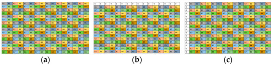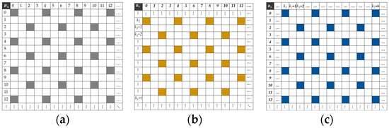 Spatial distribution of pixels in the sparse image of the spectral band B1. (a) is the sparse image of spectral band B1. (b) is the sparse image of spectral band B11 with the camera displacement on the vertical axis of k1 pixels. (c) is the sparse image of spectral band B12 with the camera displacement on the horizontal axis of k2 pixels.