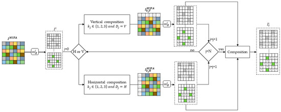 The sparse image composition method is performed in 3 steps, as shown in Figure 6. The first step is to take an initial snapshot of a scene. This snapshot provides a mosaic image , which is decomposed into sparse images using Formula (2). Then we set the number N of compositions we want to make by specifying the displacement scalars kj, and the axes Dj. Finally, we obtain composite sparse images , which contain more available pixels. The symbol “?” in the composite sparse images , indicates the areas where new pixels can appear depending on the displacement combination. This composition method reduces the distance between two non-null pixels and is limited to three compositions. Beyond three compositions, implementing such a method can be very time consuming.