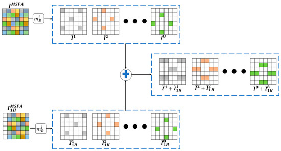 Let us define as the mosaic obtained with camera displacement of kj pixels, where kj ∈ {1, …, 3}, along the Dj axes, which can be either horizontal (H) or vertical (V). Synthetically, these mosaics are obtained by shifting the bands of kj pixels along the Dj axes. This produces bands , which are mosaicked with our MSFA moxel.