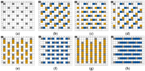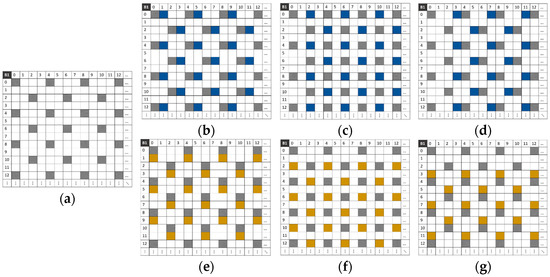 Pixel distribution in the composite sparse image for each camera displacement. (a) without displacement. (b–d) with displacements of 1, 2, and 3 pixels on the horizontal axis, respectively. (e–g) with displacements of 1, 2, and 3 pixels on the vertical axis, respectively.