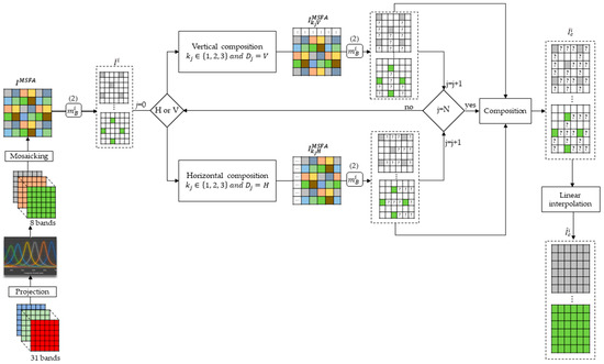 Jeong et al. [22] proposed a method to improve image quality by estimating a pseudo-panchromatic image using an iterative linear regression model. It then performs directional demosaicing, a technique that combines the pseudo-panchromatic image with spectral differences to produce a final interpolated image. The process includes steps such as directional interpolation using the BTES method [23] and calculation of weights to improve the accuracy of the final multispectral image.