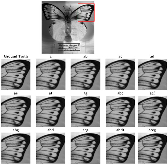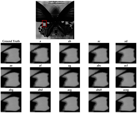Figure 11, Figure 12 and Figure 13 show the reconstructions of fine details in images containing abrupt transitions, non-homogeneous areas (Figure 11 and Figure 12), and textured regions (Figure 13). We will compare the quality of images reconstructed from sparse and composite sparse images by selecting and zooming in on a 60 × 60 pixel area from “Butterfly8”, a 155 × 165 pixel area from “Butterfly”, and a 130 × 104 pixel area from “Party”. The selected areas are indicated by red boxes in the original images. The quality of the reconstructions improves from two snapshots to four. We also note a significant correlation between the spatial distribution of pixels in the sparse image and the reconstruction results.