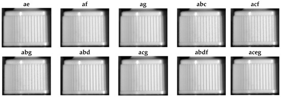 The ‘abc’ displacements represent three different snapshots taken by a camera. The first snapshot is taken without any displacement, the second snapshot is taken after a horizontal displacement of one pixel, and the third snapshot is taken after a vertical displacement of one pixel. The values in each cell of the table represent the average of the eight spectral bands. Using this quantitative evaluation method, we can compare the values obtained from composite sparse images with the values obtained from sparse images without any composition. Note that the tables do not cover all possible combinations of camera displacements but only a selection. The results indicate that images reconstructed from composed bands are of higher quality than those reconstructed without band composition. However, the quality of the reconstructed image depends not only on the specific composition used but also on the individual image.