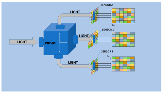 In practice, the implementation of our method is possible, in particular, by using a tri-CCD system to capture and restore a motion scene of objects [33]. This acquisition system has a beam splitter to split the light into two other axes. The prism redirects light to three sensors that capture a mosaic of the same scene with different observations, providing three mosaics of the same scene with different spatial information distributions. For static objects, a micron-precision camera translation system would be required to capture and restore the fully defined image. Figure 14 illustrates the operation of a tri-CCD system where each sensor is equipped with an MSFA.