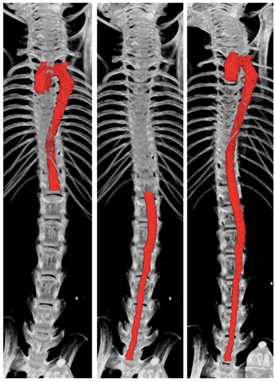 To assess intra-observer variability, the same observer evaluated intra-observer variability on two consecutive occasions by reconstructing the μCT 3D measurements from the raw data (Figure 3). The results showed a strong positive correlation for the thoracic aorta (R2 = 0.99, p = 0.0004) with no noticeable intra-observer variability (bias: 0.79 mm, LOA: 1.35 to 0.24) (Figure 3A). For the abdominal aorta, the correlation was also strong (R2 = 0.96, p = 0.002) with minimal intra-observer variability (bias: 0.45 mm, LOA: 1.18 to −0.26) (Figure 3B). The whole aorta measurement exhibited a strong positive correlation (R2 = 0.87, p = 0.01) with no significant intra-observer variability (bias: 0.23 mm, LOA: 2.98 to −2.51) (Figure 3C). These results indicate high consistency and reproducibility of μCT measurements when conducted by the same observer.