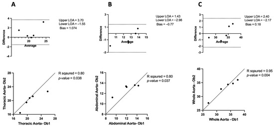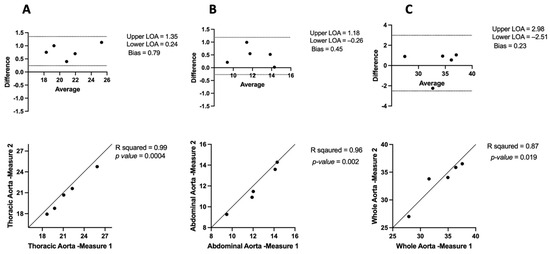 Bland–Altman plots and correlation analysis of intra-observer variability in μCT: (A) in the thoracic aorta, (B) abdominal aorta, and (C) whole aorta.