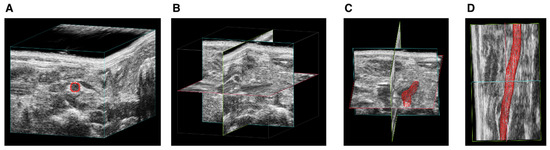 Steps of ultrasound (USS) three-dimensional lumen volume measurement (3DLV) reconstruction of the suprarenal and infrarenal aorta. (A) Cube view of the infrarenal aorta, (B) cross view, (C) surface view, and (D) overlay view.
