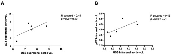 Correlation of Micro-CT (μCT) 3D volume against ultrasound scan (USS): the aortic volume measurements of μCT and USS in (A) the suprarenal aorta (B) and the infrarenal aorta.