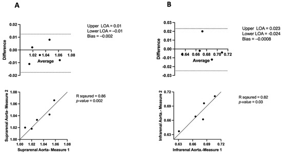 The Mann–Whitney U test was used to assess APmax intra-observer variability between Measurement 1 and Measurement 2 across the suprarenal and infrarenal aorta. For the suprarenal aorta, the median for Measurement 1 was 1.22 (IQR: 1.09–1.26), and for Measurement 2, it was 1.22 (IQR: 1.11–1.24). The test showed no significant difference between the observers (U = 12, p > 0.99). In the infrarenal aorta, the median for Measurement 1 was 0.83 (IQR: 0.81–0.85), and for Measurement 2, it was 0.83 (IQR: 0.80–0.85). The test indicated no significant difference between the observers (U = 11.5, p = 0.88).