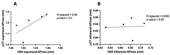 In the comparison of the anterior–posterior maximum diameter (APmax) measurements of aorta volume obtained by μCT and USS, we observed distinct differences between the suprarenal and infrarenal aortic regions. In the suprarenal aorta, there was a positive linear correlation between μCT and USS volumes (R2 = 0.46, p = 0.2) (Figure 10A). However, the infrarenal aortic volume measurements showed no correlation (R2 = 0.003, p = 0.92) (Figure 10B). The mean differences between μCT and USS APmax were 0.15 mm3 (suprarenal) and 0.15 mm3 (infrarenal), but these were not statistically significant, with p-values of 0.01 and <0.0001, respectively.