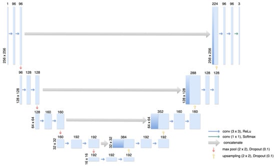 Illustration of the Multiclass U-Net-based Architecture. The encoder structure receives an input grayscale image of size 512 × 512 as input and consists of 4 encoder blocks with the filter sizes 96, 128, 160, and 192. Each block is built from two 2D convolutional layers with a kernel size of 3 × 3 and ReLU activation and is followed by batch normalization, max pooling for encoding, and dropout with a dropout rate of 0.1. The bottom of the U-shaped architecture consists of the same layers and properties as before but is followed by a 2D-up sampling layer and a dropout rate of 0.1. The decoder structure is built symmetrically to the encoder structure but receives two inputs: the output of its counter-encoder part and the output of the preceding decoder block. This way, information about different resolutions can be maintained. The last decoder block is followed by a final 2D convolutional layer with a kernel size of 1 × 1 and a filter size of 3 with Softmax activation, resulting in 3 output maps.