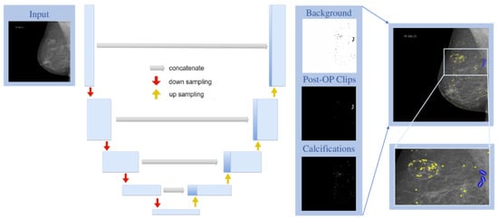 Utilizing machine learning techniques, such as the application of a U-Net, can serve this need and offer a pathway for implementing standardized classification methods such as triaging high-risk patients and optimizing workflow in quality control, such as automatically excluding cases for PGMI evaluation []. While deep Convolutional Neural Networks (dCNNs) have proven effective in analyzing medical images, there has been ongoing evaluation of various deep learning algorithms over time. For instance, a dCNN has demonstrated successful classification of mammographic images based on breast density according to ACR BI-RADS criteria []. In a separate study, the same dCNN was utilized to accurately detect and classify breast lesions in ultrasound imaging, achieving high accuracy []. Despite advancements in automated detection methods, challenges in postoperative clip detection in mammography persist due to image variability and artifacts. Traditional machine learning methods often struggle with complex patterns in medical images, whereas deep learning, particularly convolutional neural networks (CNNs), shows promise by learning features directly from data. Among CNN architectures, U-Net stands out for its effectiveness in biomedical image segmentation, capturing both local and global contexts. The adoption of a U-Net architecture, in particular, has emerged as a promising approach for processing medical image data []. Therefore, we categorized 1401 mammographies and tomosynthetic images into three groups: ‘background’, ‘calcifications’, and ‘post-operative clips’, based on annotations by an experienced radiologist.
