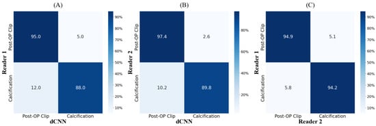 Confusion matrices showing the predictions of the defined classes post-operational clips and calcifications of the dCNN and two readers. (A,B) show the performance of the dCNN compared to readers 1 and 2, respectively. In comparison, the agreement of the two readers for classification is shown in (C).