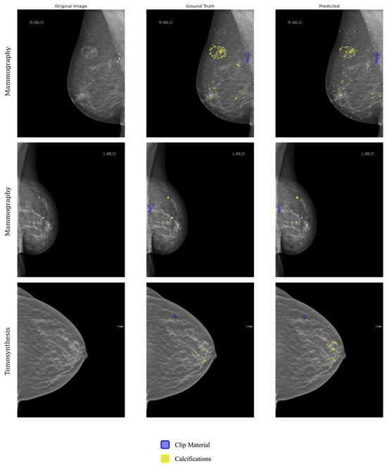 Accurate interpretation of mammographic or tomosynthetic images necessitates significant experience, expertise, and a systematic approach to ensure precise diagnosis and effective communication with patients, particularly during the post-operative follow-up phase after breast cancer treatment [,]. Post-operative clips play a crucial role in identifying surgical sites and highlighting the potential necessity for additional imaging modalities, such as ultrasound, to rule out residual or recurrent cancerous lesions in the previous tumor bed. However, in daily practice, these clips may be easily overlooked or misinterpreted, especially when captured in an orthogonal position and mistaken for calcifications. Hence, there is a pressing need for a technique enabling observer-independent detection of clip material to promptly signal the requirement for further diagnostic assessment of post-operative breasts, thereby optimizing patient risk stratification.