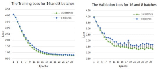 Figure 6 shows the training process on the Argentine Sign Language dataset. The loss indicates the convergence speed and stability of the model. We compared the training loss and validation loss of batches 8 and 16 at 30 epochs, respectively. From the figure, it can be seen that the fusion of the pre-train ResNet and LSTM network framework had a good convergence efficiency in the recognition process. It gradually stabilized at 23 epochs, with a training loss value of around 0.8 and a validation loss value of around 1.0. The reason for this situation is that the number of verified sign language datasets is too small. There was no vanishing gradient during the training process, and the use of the pre-trained model better demonstrated that our proposed method can reduce the training time while ensuring a good recognition accuracy, thereby ensuring good robustness of the model.