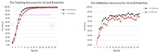 In Figure 7, we compare the training accuracy and validation accuracy, and the accuracy better reflects the model efficiency and usability. During the training process, the training accuracy gradually approached 100%, and the model stabilized at 19 epochs. In the subsequent training process, the training model showed a fitting phenomenon, and the model achieved a recognition rate of 100%. During the validation training process, the validation accuracy of 16 batches was higher than that of 8 batches, reaching a maximum of 86.25%. The reason for this situation is largely due to the input data. We divided each video into 16 frames of video segments, and during the training process, 16 batches were also grouped into one epoch. This network design can better extract features, but from Figure 7, the amplitude of this network’s variation is within a controllable range, which has little impact on recognition efficiency.