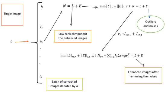 Each of these retinal images depicts identical objects and exhibits high correlation with one another. Often, these images are marred by issues such as image blurring due to various adverse annoying effects. Then, it is possible to stack these images into a matrix: N = [ v e c ( R 1 0 ) v e c ( R 2 0 ) v e c ( R n 0 ) ] m × n , as such v e c ( · ) used to denote the vectorization operators for the purpose of stacking images. As such, the original images N can be further decomposed N = L + E [70,71], where L m × n is a clean low-rank or enhanced image, and E m × n denotes a sparse error matrix incurred by outliers or corruptions. The RPCA by [53], which decomposes highly corrupted retinal images as low-rank, can name enhanced image and anomalies as sparse in the form of optimization techniques given by