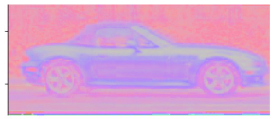The YUV color space [20,21] is potentially advantageous for applications in vehicle re-ID due to its separation of luminance (Y) and chrominance (U and V) components as shown in Figure 5, Figure 6 and Figure 7. This distinction mirrors human visual perception, where luminance carries significant information for recognizing the shapes and edges critical for identifying vehicles. With a channel dedicated to luminance, a network may better learn features relevant to vehicle shapes and structures that are stable under various lighting conditions and color variations. The 24-bit YUV configuration we use here preserves all the color information present in an original RGB image, thereby supporting discrimination among vehicles with similar structures but different color characteristics.
