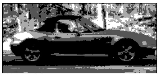 Both the 12-bit RGB and n-bit grayscale conversions involve two core steps: a reduction in the number of distinct intensity levels and subsequent normalization. Continuing this thread, we consider the grayscale conversion, generalized to n bits, with our analysis variously taking n as a value in the set . In Figure 14, Figure 15 and Figure 16, we show 4-bit grayscale, 2-bit grayscale and binary images respectively.