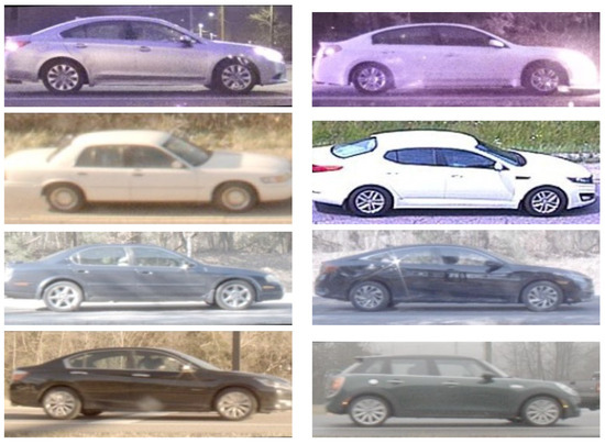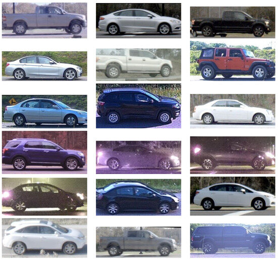 Experiments use the Profile Images and Annotations for Vehicle Re-Identification Algorithms (PRIMAVERA) dataset [23], a comprehensive collection of side-view vehicular images employed in previous research on vehicle re-identification [24,25]. This dataset contains 636,246 images of 13,963 distinct vehicles, including daytime and night-time captures, collected over several years. For categorization of the images, the term daytime is defined as the period between local sunrise and sunset, whereas nighttime refers to the remainder of the day. Cameras equipped with 1.8–6 mm lenses were placed at various elevation angles and photographed passing vehicles from distances of 1–20 m. License plate readers established ground truth labels for the objects. Figure 17 displays select images illustrating the diversity of the dataset.