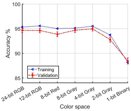 Table 1, Table 2, Table 3 and Table 4 show overlap among the accuracy confidence intervals from 24-bit color spaces down to the 4-bit Gray level for multiple training and verification datasets. Because model development is an inherently stochastic process, variation in accuracy is observed even when training is repeated using the same color space. Furthermore, this variation can supersede milder trends that are a function of color space. Loss of color resolution is only observed to materially degrade accuracy when we consider cases with less color resolution than 4-bit Gray.
