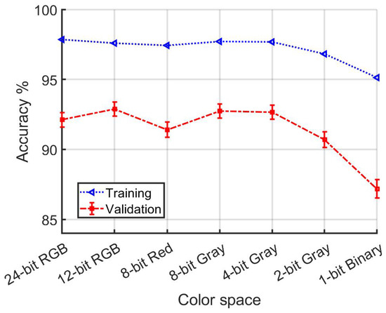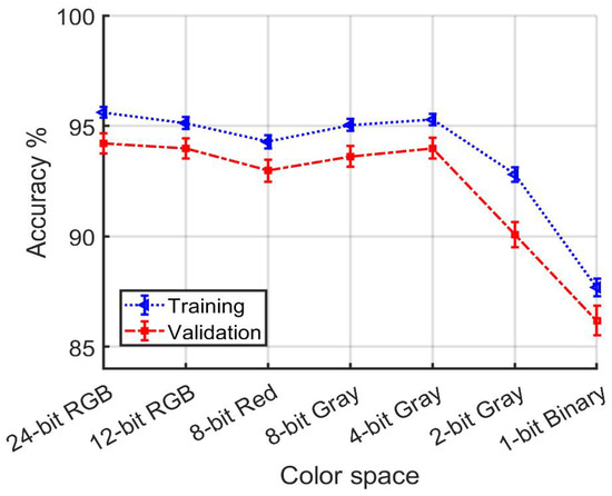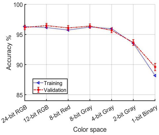 A notable and perhaps surprising result is how gradually model performance degrades with reduced color resolution. Figure 20 shows that training and validation accuracy are comfortably above 90% even as color resolution is systematically reduced to 2 bits per pixel. Significant changes in performance become evident only when the information loss approaches the level of yielding a binary image. Indeed, the confidence intervals for accuracy using all data in Figure 20 overlap from 24-bit RGB to 4-bit Gray.