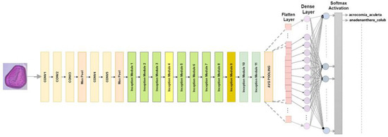 The fundamental module of this model is known as the Residual Origin Block. A 1 × 1 convolution layer is employed after each block to increase the size of the filter bank to match the input depth. Batch normalization is only applied to the traditional layers of this architecture. Featuring 164 layers deep and an image input dimension of 299 × 299 , InceptionResNetV2 incorporates residual connections to blend convolutional filters of varying sizes. This use of residual connections avoids the degradation problems associated with deep networks and reduces training time [30]. Our refined model of InceptionResNetV2 for the classification of Pollen73s is illustrated in the Figure 10.