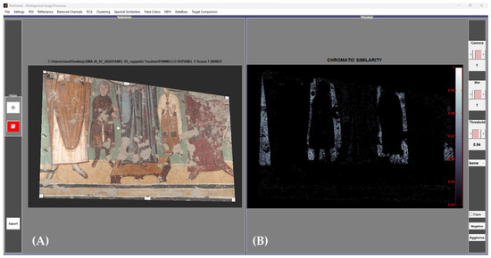 Graphical user interface of the PickViewer® software (Version 1.0). (A) The calibrated RGB image of the painted area (Theodotus Chapel) with the point (white dot) selected for the mapping. (B) Result of the chromatic similarity algorithm, where the white pixels have similar color data, and the black ones have no similarity with the selected green color of the background.