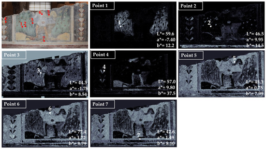In the first examined area, seven main colors have been identified. Point 1 in Figure 2 refers to the light green background whose average chromatic coordinates are: L* = 59.6, a* = −7.40 and b* = 12.2. From the map of the chromatic similarity, the green color is distributed in the background of the area (white pixels in the map) and not in other parts of the painting.