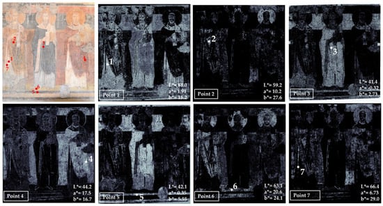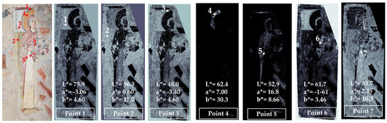 The last examined area is that of Pope Stephen II (Figure 10). The seven selected points represent the man’s color observed on the painting: white (point 1), yellow (point 2), black-gray of the dress (point 3), red (point 4), black of the frame (point 5), light yellow (point 6) and another red (point 7).