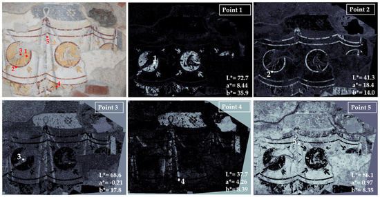 Area 5 has been chosen in the so-called Theodotus Chapel, which is located on the left side of the church with respect to the central apse. The results of the color measurements and mapping are shown in Figure 7.