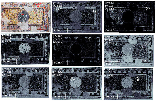 Lastly, the green color characterizes the background of the area, as visible in Figure 7 (mapping point 8). The chromatic coordinates identify a real green color (a* has a negative value), and the mapping clearly defines the distribution in the background of the scene.