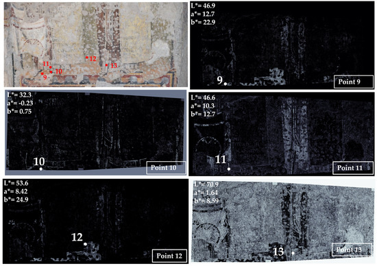 Point 6 is a thin white line (the sole white zone where it was possible to take a color measurement). Apart from the yellow zones, white is present in all the other colors and in the grouting, according to the obtained mapping. In medieval wall paintings, white is usually obtained by using calcium carbonate from various sources, which is also the binder of the pigments in the fresco technique, so it is not strange to find this white combined with the other colors [40].