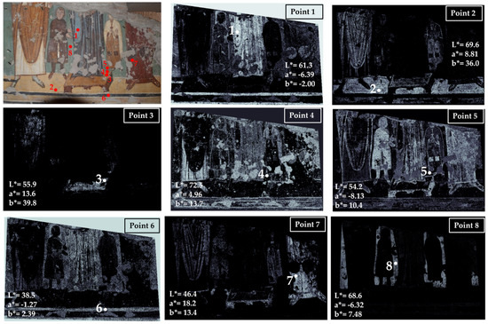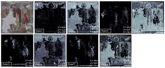 In this area, we sampled eight points corresponding to the main colors visible on the paintings: dark and light gray bluish (1 and 2, respectively), yellow (point 3), green (point 4), dark red (point 5), black (point 6), brown (point 7) and white (point 8).