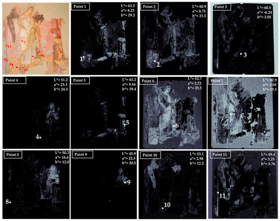 Point 7, corresponding to a white area, has been mapped in the entire area, apart from the yellow, red and blue zones; even that referred to point 1, which is a slightly bluish white. This led to assuming a different mixture for obtaining the white in the garment and that in the frame with the inscription. Considering the similarity between point 1 and point 6 colors, it may be derived that the difference with the white in point 7 is due to the presence (in points 1 and 6) of a blue pigment or a pigment having a bluish hue, such as, for example, vine black. This last black pigment, in fact, gives a clear bluish hue to the wall painting if mixed with lime white, and is frequently used due to this characteristic [38].
